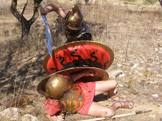 Οι ασπίδες ορισμένες φορές σκόπιμα απεικόνιζαν τρομακτικές παραστάσεις από τη μυθολογία, όπως η εικονιζόμενη κεφαλή της Μέδουσας, με σκοπό την τρομοκράτηση του αντιπάλου. (Φωτογραφία από την ιστοσελίδα του Αρχαιοπρεπούς Οπλιτικού Αγήματος «Κορύβαντες» www.koryvantes.org) |